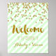 Welcome to our wedding sign poster in light pastel mint green and white stripes pattern with gold confetti and handwritten style lettering.