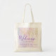 A welcome to our wedding tote bag. Designed with fake gold confetti sprinkled along the top. A pale purple and yellow watercolor background.