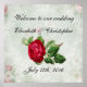 Welcome to our wedding poster with an elegant vintage old world flair. An illustration of an open blossoming red rose with the stem visible and surrounded by green foliage. The background has a marble grey mottled parchment appearance with faint and faded pink roses in the background.