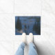 In this fantasy-like scene on a winter night, an icy path leads between snowdrifts down the hill and over the river to a welcoming cottage with candles in the window. The trail and stepstones across the water are lit by warmly glowing lanterns, and a bonfire beside the path sends sparks into the cold night air.