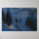In this fantasy-like scene on a winter night, an icy path leads between snowdrifts down the hill and over the river to a welcoming cottage with candles in the window. The trail and stepstones across the water are lit by warmly glowing lanterns, and a bonfire beside the path sends sparks into the cold night air.