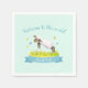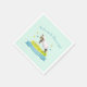 Spring lamb skipping cute new baby welcome to the world personalized aqua party napkins. Cute new baby card featuring cute a watercolor painting of a whimsical lamb skipping in a flower meadow with yellow and blue butterflies, your own name choice in a teal aqua graphic ribbon. Cute lamb on a light aqua blue sky background ideal for a farm themed new baby themed baby welcome party or gathering. Other cute sheep matching items available. © Uniquely painted in watercolor and designed by Sarah Trett for www.mylittleeden.com