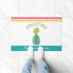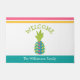 “Welcome”. Bring a bit of tropical island hospitality into your home with this chic, modern doormat. A modern, graphic, turquoise teal blue, green, pink and orange pineapple, pink and orange stripes, spring green handwritten typography, along with your family name/message on a turquoise blue band, overlay a white background. Adds a fun, festive feel to your front door!