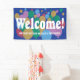Welcome banner with a colourful floating balloons background and the word Welcome in white. Add more text on the line below or delete that text field if not needed.