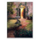 From an original oil painting by Brenda Thour of the light shining from an open doorway onto a birdbath and flower garden in the evening. Copyright 2005.