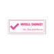 This inspirational rubber stamp design features the encouraging message "WELL DONE!" and a personalized teacher's or educator's name. It also features a decorative checkmark icon. It could be used by a school teacher, educator, instructor, or tutor when marking assignments, to indicate that a student has done well.