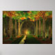 A great hall cut in the side of the hill, and along each wall an aisle of trees. At the far end a shallow bay with an arched roof, and a little stream tinkling down the wall like a fine curtain in front of it. In the bay a table and two vessels, which glow with a golden and a green light. The blending of the two lights is like the summer sun shining through young trees. The trees also glow, every leaf edged with light, green and gold and red.