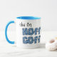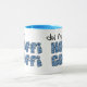 An attractive white ringer mug with a Powder Blue Lip and Handle and 'I like coffee' in the Welsh language'. The letters are filled with a blue and white Egyptian pattern.
