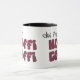 An attractive white ringer mug with a Black Lip and Handle and 'I like coffee' in the Welsh language'. The letters are filled with a red and green geometric pattern. You may prefer to change the background color by using the Customize button and then the Edit > Background button.