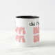 An attractive white ringer mug with a Black Lip and Handle and 'I like coffee' in the Welsh language'. The letters are filled with a Bright Red and White Pinwheel pattern.