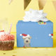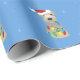 A Welsh terrier is draped in Christmas lights, adorned with a Santa hat, and has a fir branch sticking out of its mouth in this light blue Christmas wrapping paper.