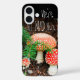 Photograph of a group of red and white fly agaric mushrooms under a pine tree. The text above reads "We're all mad here", a line from Alice in Wonderland.