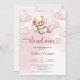 Remarkable design for girl Baby Shower invitations features Watercolor Cute sleeping bear over the clouds. Modern playful calligraphy font lettering with heart says "We're on cloud nine".