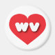 This magnet features a vibrant red heart containing the bold, white, rounded lower case letters wv, a playful abbreviation for West Virginia, the mountain state.