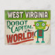 A funny West Virginia vintage travel postcard featuring a friendly robot with fun retro style text that says, "West Virginia, Robot Capital of the world!"