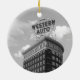 A Western Auto sign encircled by an arrow sits atop an excellent semi-cylindrical brick building. The sign's orientation on the roof highlights the building's curved structure. A few white clouds hang in the background.