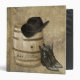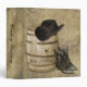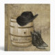 A rustic country themed design on a grunge background . A wooden barrel with cowboy boots and hat compliment the sepia tone Vintage western design. Don't forget to add the bride and groom's names.