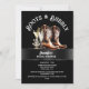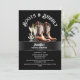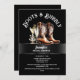 A tooled leather pair of brown cowgirl boots with a white ornate floral pattern on it has a watercolor chic glass of bubbly and martini next to it set above a faux shimmer horizontal black band set against a white background. Editable white text templates may be personalized to suit your special celebration. This stylish dowloadable invite is ideal for a western themed, country "boots and bling" or "boots and bubbly" special event too.