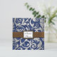 Western Denim & Leather Bridal Shower Invitations---match the wedding suite found below on this page. Each invitation features a floral leaf damask print in silver gradient over a printed denim background. The front also features a brown leather printed band with a square monogram that reads Bridal Shower in elegant cursive writing. These bridal shower invites are set to high quality basic card stock; however, you can change the stock to linen, felt (embossed), recycled, and several metallic shades if you would like under number 2 (choose your style, size & paper type) below the orange add to cart button. A list of the additional costs for a fancier card stock are displayed also under that option. Each invitation comes with a fitted white envelope.