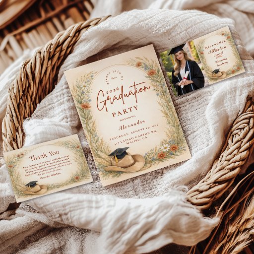 Celebrate your graduate with a warm western-inspired design featuring classic cowgirl boots, delicate wildflowers, and soft prairie grasses framing the layout. The earthy neutral palette of beige, sage, dusty blue, and warm terracotta creates a refined ranch aesthetic that feels both modern and timeless. Perfect for country-loving grads, rodeo girls, or anyone who dreams bigger under open skies. A beautiful blend of rustic charm and elegant botanical detail for a memorable graduation celebration.