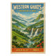 Travel poster featuring the Western Ghats, India, in a classic retro travel-poster style. Central focus on lush emerald mountains cascading into misty valleys, with waterfalls, tea plantations, and tropical forests stretching into the distance. Soft monsoon light and drifting clouds create a fresh, vibrant highland atmosphere. Rich color palette of jungle green, waterfall white, sky blue, and warm earth tones. Clean graphic illustration with subtle vintage grain texture. Bold vintage typography headline: “WESTERN GHATS – GREEN HEART OF INDIA”. Vertical 2:3 layout, high-resolution, print-ready.