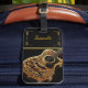 This Luggage Tag exudes sophistication with its white and gold acoustic guitar and finely detailed cowboy design, all set on a sleek black backdrop.