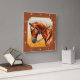 Beautifully painted portrait of a golden sorrel quarter horse with flaxen mane sporting a fancy western pleasure show bridle and saddle. A copper coloured patterned background gives it a rustic feel, perfect for decorating a country style or southwest desert home.