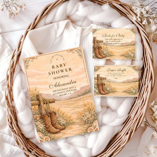A soft western-inspired baby shower design featuring warm desert tones, delicate wildflowers, and a serene canyon landscape. The vintage western details and neutral palette create a calm, timeless look—perfect for a desert, ranch, or Southwest-themed celebration with an elegant, storybook feel.