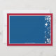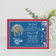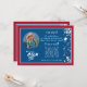 A blue invitation double-framed with white and red. The circular picture window is embellished with a western hint of stars and swirls. Suitable for either gender and any age. The card is easy to customize with your wording, font, font colour and choice of six paper types.