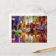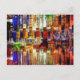 This colourful abstract art postcard depicts rows of liquor bottles reflecting light on a bar counter surface.