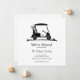 This elegant minimalistic black silhouette is of a golf cart with golf bag and a bucket of golf balls for a moving announcement.