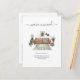 This moving announcement card is modern and features quirky, boho plants, a couch, and a cat relaxing on it. Check out the rug and the wall art and vintage overhead lamps. Something your recipients would smile about