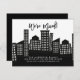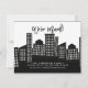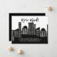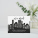 Modern moving announcement for a new apartment featuring a cityscape with apartment buildings.