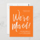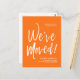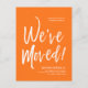 A minimal solid Pumpkin Orange and white script-style moving announcement postcard. It features a large script text of the words "We've Moved" followed by your address information below it. Many individual elements of the invite card are unlocked so feel free to change or add any details necessary by using the customization function.