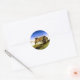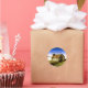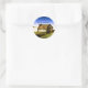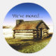 This sticker features the image of an old log cabin, a very small one, probably just one room, with a door at the front and a chimney at the back. This image was originally a photograph but has suffered through a great many digital effects since then, so it is highly stylized and quite dramatic. It reads, "We've moved," but you can change that to something else if you'd rather.