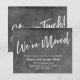 Keep your friends and family up to date with your new address using these simple, elegant announcement cards. Whether you're a newlywed or just want a unique design for letting your tribe know how to find you, this card is versatile enough for anyone. It features pretty typography graphics that read "We've Moved" on the front and "Stay in Touch!" on the back, using a modern, casual, handwritten script font. Use the template fields to add all your details to personalize this design for your own use. The white type was placed over a grey vintage textured grunge background. If you'd rather replace this with a different background image, that's also possible! // 105 //