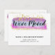 "We've Moved" moving announcement postcard. With watercolor brush strokes, abstract and gold splatters. The title features a hand lettering style calligraphy font.
