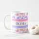 Cute pink, purple and yellow personalized with name coffee mug with sweet whales swimming on it. A perfect birthday gift, housewarming, Christmas gift.