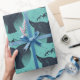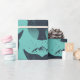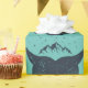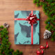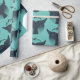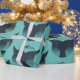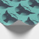 Gift wrap with a badge style graphic pattern features whale tail silhouette with mountain outline on light aqua background