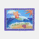 Art features the "Wipe Out Cancer Angel". The painting shows a glimmering orange surfing angel on a blue ocean with a sparkling sun. Sea foam washes up on the sand surrounding the words "Wipe Out Cancer". There is a pink sea shell on the beach. The painting was rendered in acrylic and sprinkled with glitter for texture and shine.