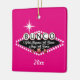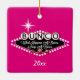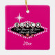 Fun vintage style graphic features a neon light style design. What Happens At Bunco Stays At Bunco is the perfect prize or holiday Bunco ornament. Features three red dice, sparkling star and the word Bunco in round dots. Background colour can be change to the colour of your choice. Add a date, name, or group name to make a personalized Bunco gift.