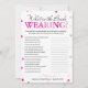 This modern What is the bride wearing game features a pink magenta background with metallic confetti. The text is written in a mix of a playful calligraphy font and a modern serif font, this card is personalized with the Bride-to-be name and the Bridal Shower date.