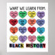 The image contains a colourful and educational poster titled "WHAT WE LEARN FROM BLACK HISTORY." The poster features 16 heart-shaped icons, each with a different message, and a colourful "BLACK HISTORY" text at the bottom. Each heart contains an inspirational action or quality followed by the name of a notable figure in Black history.