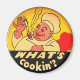 What's Cookin'? Old fashioned, retro refrigerator magnet. Happy chef dishes up that retro catch phrase from the '40s - Meaning, "what's up?", "what's going on?" Yellow, red, and black kitchen magnet to accent your kitchen.