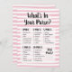 Pink and white What's In Your Purse game for baby showers or bridal showers. Hand drawn white horizontal stripes.