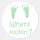 What's Kickin'? baby stickers, with cute little baby feet in green. Also available in pink or blue.