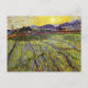 A fine art postcard with the post-impressionist painting, Wheat Field with Rising Sun (1889), by Vincent van Gogh (1853-1890). The morning sun rising above the mountains, casting its light upon the wheat fields below.