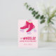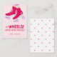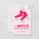 I'm WHEELIE happy we're friends! A personalized sweet classroom Valentine's Day card featuring hot pink roller skates, purple wheels, a hand lettered greeting, and a happy heart backer.