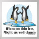 When on thin ice, might as well dance. Funny and witty slogan / saying with two penguins dancing together on cracked ice. What's the sense of worrying when you can't change the circumstances. Don't worry, be happy! With a blue background. Winter Penguin Graphic Design.