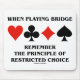 Duplicate bridge players will enjoy this mousepad with the bridge truism saying "When Playing Bridge Remember The Principle Of Restricted Choice". Make others do a double-take about exactly what cards are held in the hands of your partner and the opponents with this bridge attitude mousepad featuring all four card suits.  Memorable advice for die-hard bridge players who love to decide at the bridge table!